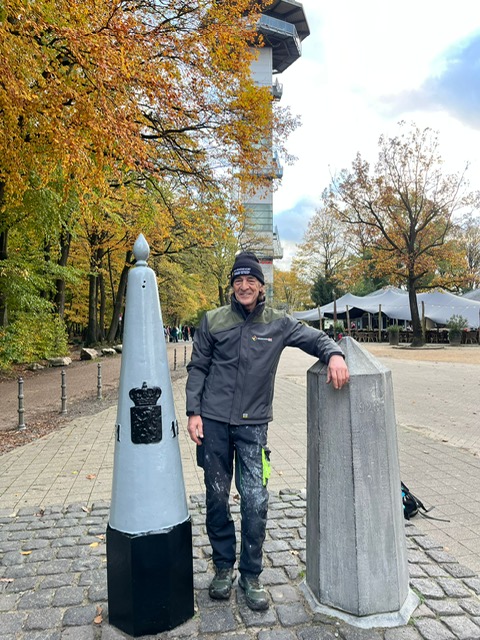 Sinds 1843 staan tussen Nederland en België grensmarkeringen. Grenspalen van metaal en grensstenen. Van de provincie Limburg hebben we de meerjaren opdracht om de ongeveer 200 ijzeren grenspalen in de provincie Limburg te schilderen. Een klus die onze medewerkers op zeer bijzondere plekken brengt. Op de foto kunt U zien dat een landsgrens zich niet veel aantrekt van een perceelsgrens. Grenspaal 45 (b) staat dan ook gewoon bij een privépersoon in de achtertuin.